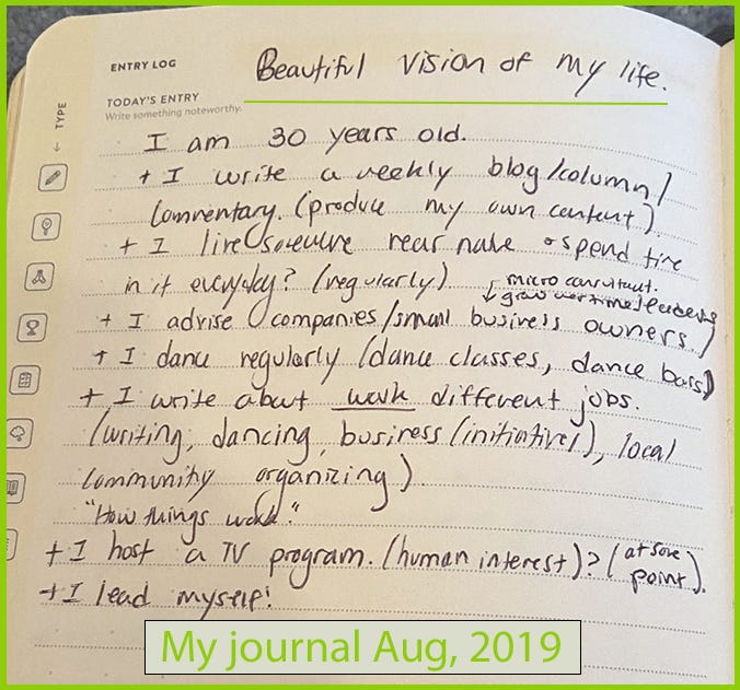 The next morning I got myself to the quiet roof of our hostel, and I sat down with my journal, my pain, and my dreams. I was 25 at the time. I gave myself space to dream by closing my eyes, and imagining I was 30. That was 5 years away; far enough that even if I was tired and terrified today, it was probably enough time to begin genuinely facing my own shit, and building a life that felt more true. My journal entry from that roof was at the top of this post.